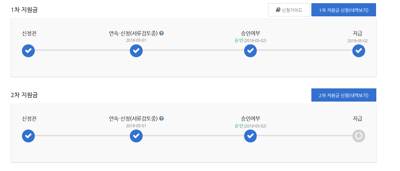 이렇게 어렵게, 어렵게 승인된 1차, 2차 지원금!!!!!!!ㅜㅜ 3차 지원금 신청은 반드시 여유롭게 하겠다고 다짐해봅니다. 흑흑... 자, 여러분들은 어서어서 미리미리 준비하셔서 신청하세요! 저처럼 하지마시구요!