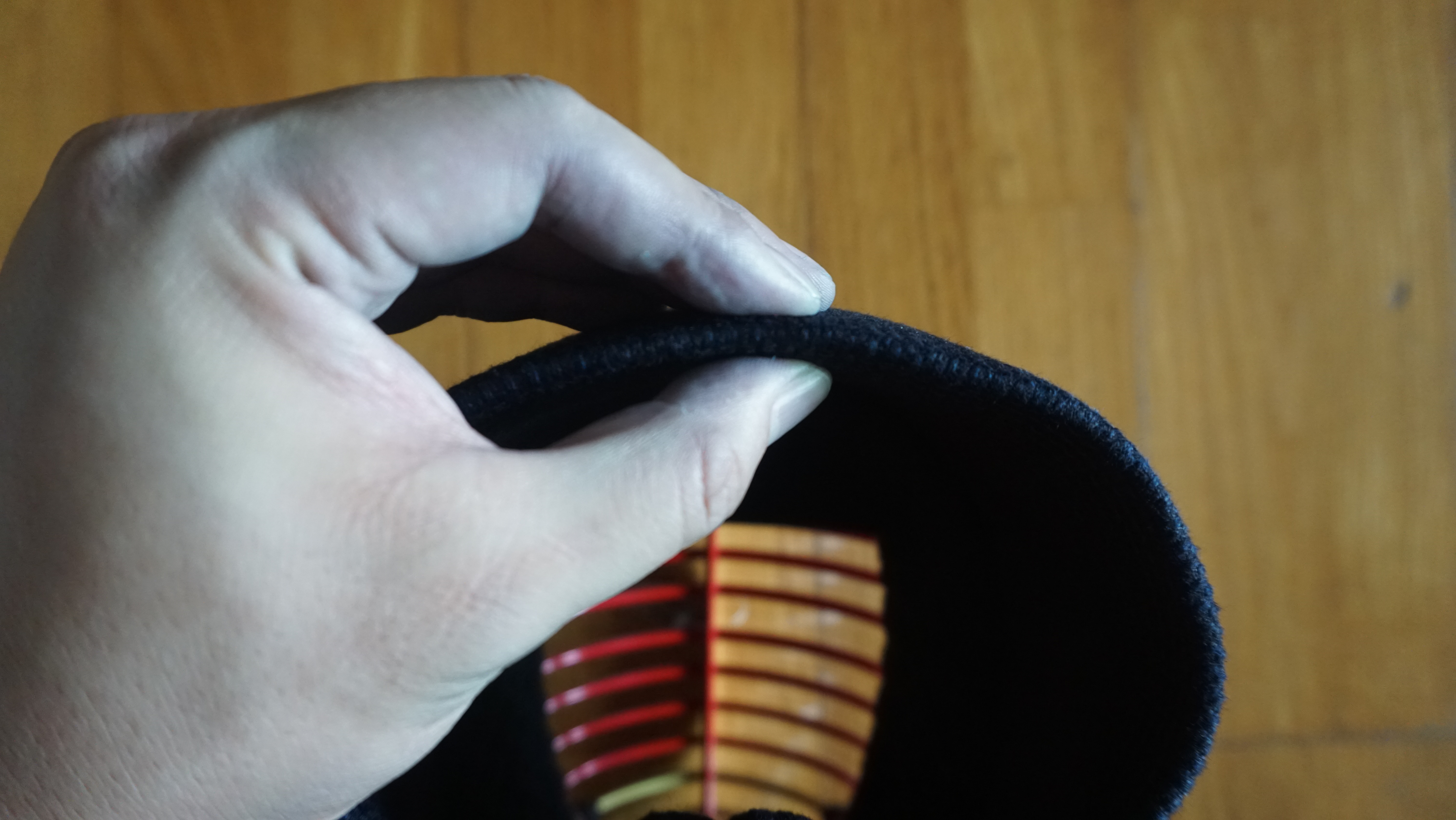 죽도로 직접 타격되어질 될 호면 상단부는 위와 같이 빵빵하게 만들어졌다. 위 사진은 호면의 가장 끝단(뒷통부 부분)이다. 이 부분도 이렇게 두툼한데, 죽도로 직접 타격되어지는 이마쪽 호면 상단부는 더 두껍다. 시합용이 아닌, 일반형이라 호면의 무게가 꽤 묵직하지만 방어는 확실히 될 것 같은 느낌이다.