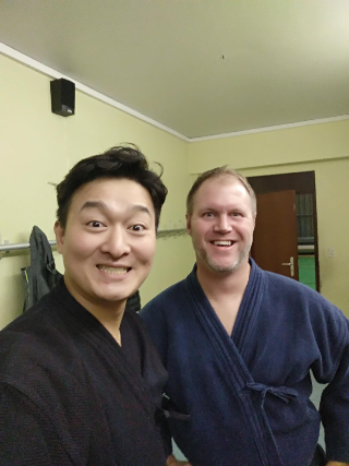내가 이곳에서 검도를 다시 시작한 날, 나에게 어설픈 찌름을 시전했던 친구가 아래 사진의 크리스라는 미국 친구다. 이 친구의 찌름으로 시합연습은 피튀기는 진짜 시합이 되어버렸는데, 진짜 교검을 한 덕분인지 이 친구와 금방 친해졌다. 친구라고 하기엔 거의 10살 이상의 나이차이가 난다 ㅎㅎ 이 친구와 칼을 맞출 때는, 다른 사람들과 칼을 나눌 때와 많이 다르다. 여러가지 생각을 하면서 검도를 하게 된다. 그래서 재밌다.