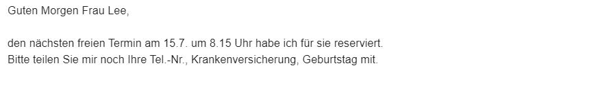 상황이 이렇다 보니, 집 근처 여러 산부인과에 연락을 해야하는 상황이 벌어지기도 합니다. 저희 부부의 경우도, 거의 10군데 정도의 산부인과에 여러차례 연락을 해서 겨우 한군데 자리를 받았던 기억이 떠오르네요. 전화 연결이 되는 병원도 있지만, 전화 조차 받지않는 병원도 많았습니다. 그래서 직접 방문보단 전화나 이메일로 연락하게 여러모로 시간을 절약하는 길입니다. 언어문제로 전화가 어려우시다면, 이메일도 괜찮은 방법입니다. 실제로 저희도 여러 산부인과에 이메일을 보냈고, 2달 뒤 겨우 테어민(예약) 날짜를 확정 받았었습니다. ㅠㅠ