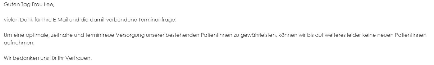 상황이 이렇다 보니, 집 근처 여러 산부인과에 연락을 해야하는 상황이 벌어지기도 합니다. 저희 부부의 경우도, 거의 10군데 정도의 산부인과에 여러차례 연락을 해서 겨우 한군데 자리를 받았던 기억이 떠오르네요. 전화 연결이 되는 병원도 있지만, 전화 조차 받지않는 병원도 많았습니다. 그래서 직접 방문보단 전화나 이메일로 연락하게 여러모로 시간을 절약하는 길입니다. 언어문제로 전화가 어려우시다면, 이메일도 괜찮은 방법입니다. 실제로 저희도 여러 산부인과에 이메일을 보냈고, 2달 뒤 겨우 테어민(예약) 날짜를 확정 받았었습니다. ㅠㅠ