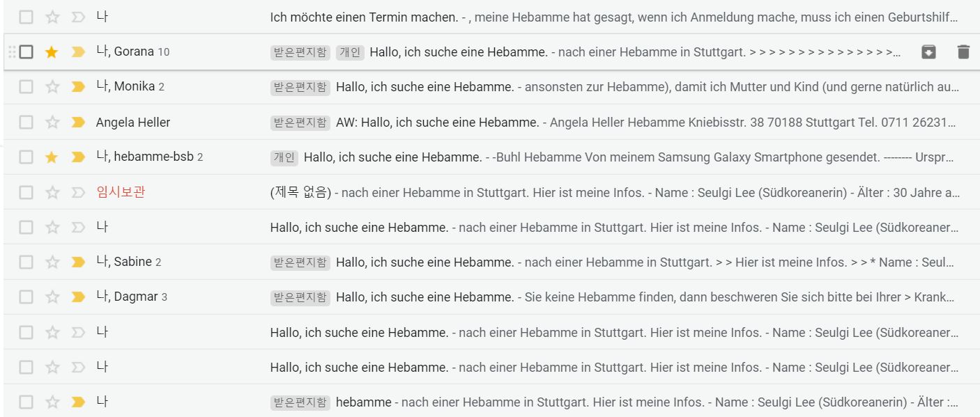 이렇게 독일에서 헤바메를 찾기란 쉽진 않습니다. 그러니 임신을 하셨다면, 최대한 빨리 헤바메를 찾으시길 바랍니다. 저희 헤바메가 말하길, "보통 사람들이 임신테스트기에 선이 그어진 순간, 바로 자기한테 전화가 온다" 고 하더라고요...ㅠㅠ