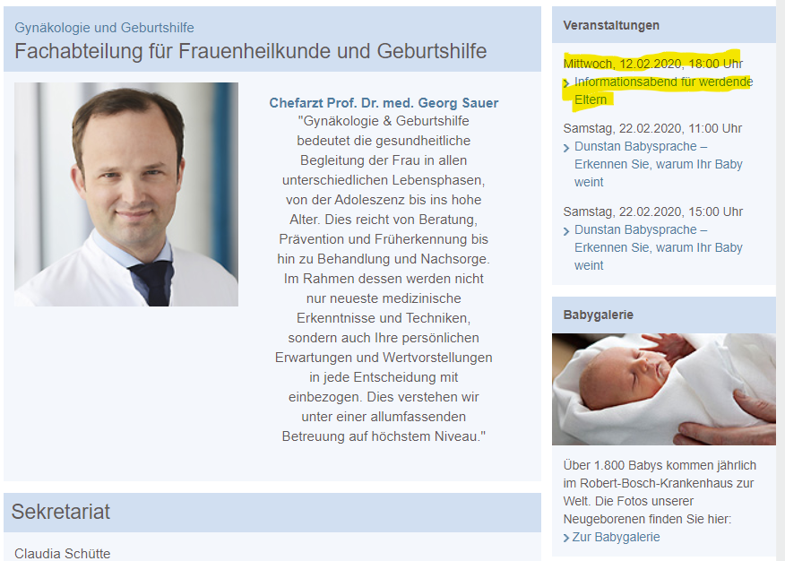 진료를 받고 있는 산부인과에서 때가되면 출산병원 리스트를 줄때도 있다. 이 리스트에 나와있는 각 출산병원 홈페이지 - Gynäkologie und Geburtshilfe(부인과&출산보조) 탭에 들어가서 잘 찾아보면 매달 설명회 일자가 올라와있다.