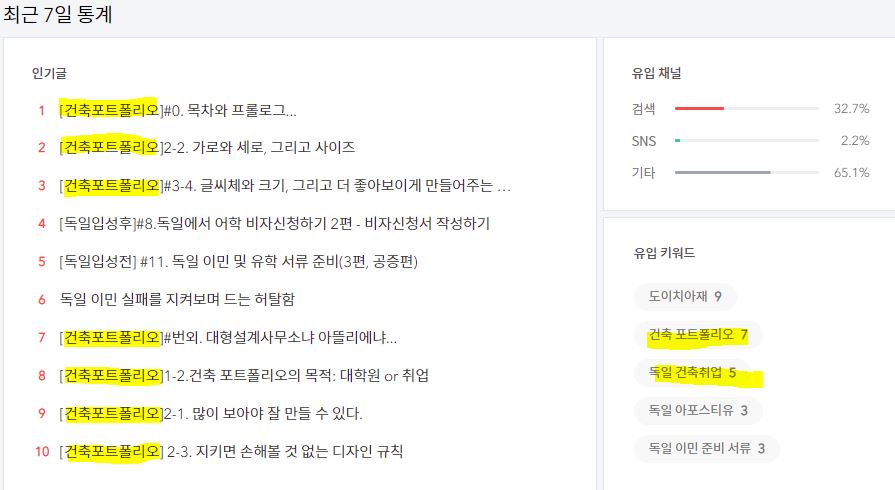 그 덕분인지... 저의 포트폴리오 연재글을 찾아서 많이 방문해 주시고, 이제는 그 분들께서 방문자의 한 축으로 자리잡으신 것 같습니다. 처음에는 한국 설계사무소의 공채기간, 대학원 지원기간 동안에만 반짝 인기가 있겠지... 라고 생각했었는데, 지금은 기간에 상관없이 꾸준히 찾아주고 계시네요.