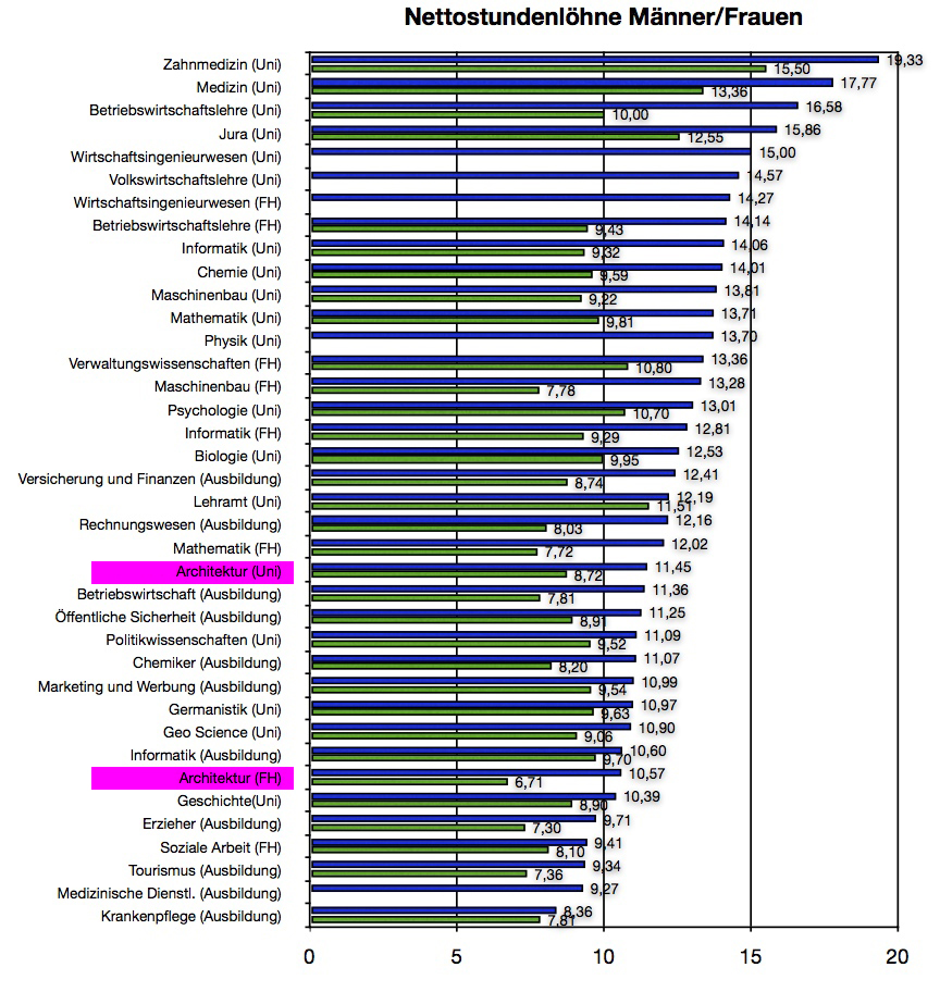 건축가는 한국에서나 독일에서나 타 직군에 비해 연봉이 많이 낮은 편인데, 인터넷에 돌아다니는 학과별 시간 당 수당 테이블에 따르면 건축은 저~~ 밑 쪽에 있다. (진로선택이 이렇게나 중요하다!!) 반면 의학, 경영학, 공학은 전부 위에 자리한다. 건축학은 전문대학(FH)을 졸업했는지, 대학교(Uni)를 졸업했는지에 따라 조금 차이가 나긴하지만, 두 학위 모두 낮기 때문에 도토리 기재기 정도 수준의 차이다. 독일의 건축가 연봉수준은 한국으로 치면 공부원보다 낮고, 사회복지사 보다는 높은 수준이라 생각하면 확 와닿을 것이다. 연봉은 낮지만, 사회적으로 인정받는 수준은 비교적 높다. 연봉과 사회적 인식의 괴리가 상당히 차이나는... 이상한 직종이지만, 현재 독일의 부족직군 중 하나기 때문에 취업은 수월한 편이다.