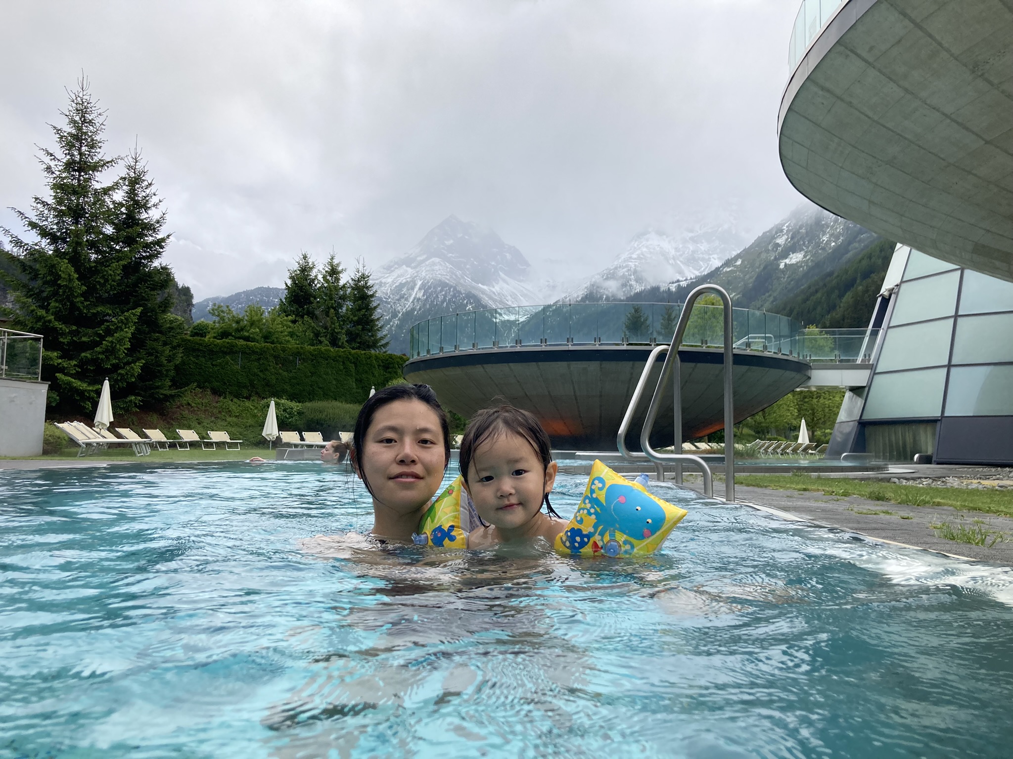 캠핑장과 약 500미터 떨어진 곳에는 아쿠아돔이라는 수영장이 있다. 여기 캠핑장에서 티켓을 구매하면 10%할인된 가격으로 살 수 있다. 수영장은 따듯한 물로 채워져있어 알프스를 바라보며 온천욕을 즐길 수 있다. 우리 가족은 마지막 날 캠핑장에서 철수를 한 후, 종일권으로 즐기다가 나왔다.