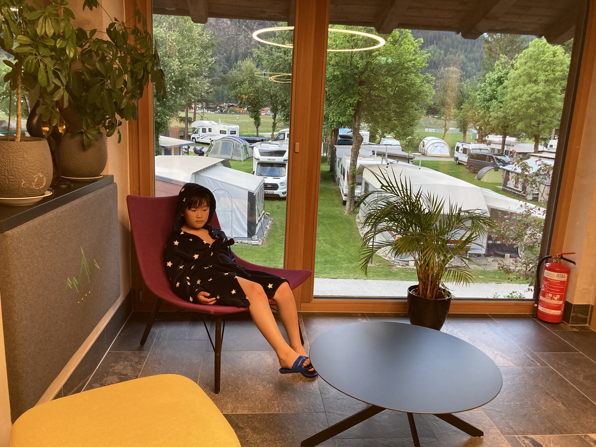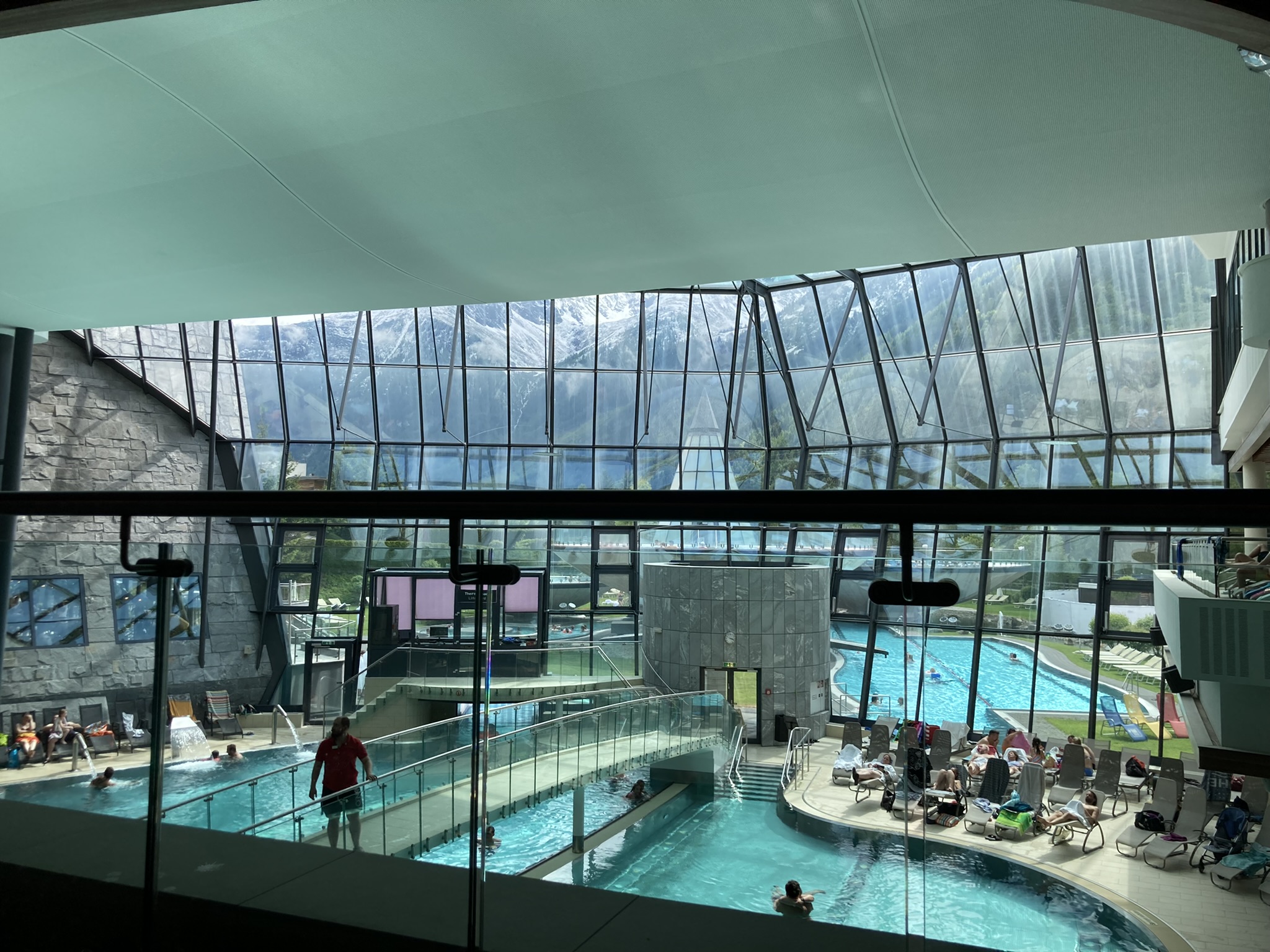 캠핑장과 약 500미터 떨어진 곳에는 아쿠아돔이라는 수영장이 있다. 여기 캠핑장에서 티켓을 구매하면 10%할인된 가격으로 살 수 있다. 수영장은 따듯한 물로 채워져있어 알프스를 바라보며 온천욕을 즐길 수 있다. 우리 가족은 마지막 날 캠핑장에서 철수를 한 후, 종일권으로 즐기다가 나왔다.