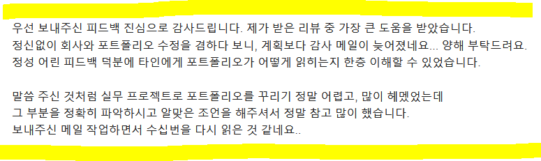 P님의 경우에도 본인만의 장점을 살리고 상대적으로 약점으로 보이는 것들을 어떻게 보완할 수 있는지에 대해 예시 이미지와 함께 안내해드렸다. 본인의 목표가 높았기 때문에 어떤 마음으로 포트폴리오를 만들어야 하는지까지 구체적으로 설명드렸다.
