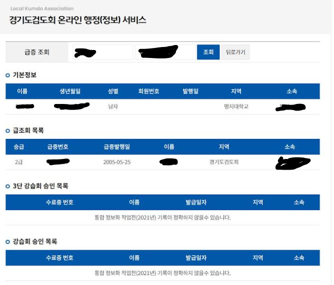 나처럼 한국에서 아주 오래전에 단증이 아닌 급증을 인정받으려면 종이로 된 급증이나 증명할 만한 서류가 필요한데, 나같은 경우에는 급증이 어딨는지 통 알길이 없었다. 다행히 대한검도 사이트에 급증을 조회할 수 있는 페이지가 있어서 조회할 수 있었다. BW주 검도협회에 재차 문의할 결과, 온라인 페이지라도 증명할 수 있다면 인정받을 수 있는 답변을 받았다.