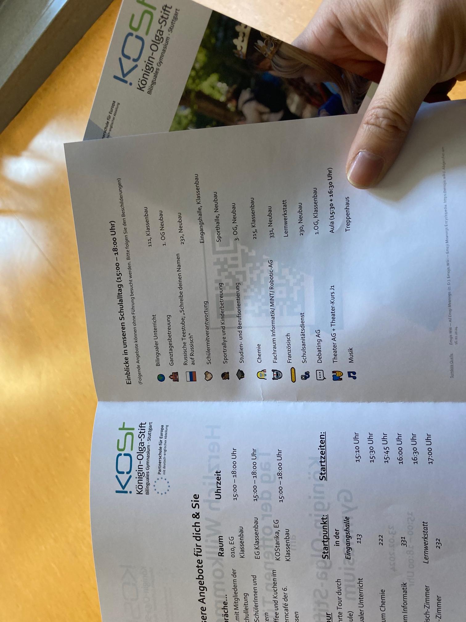 같은 날 FEG와 KOSt의 오픈하우스가 열렸다. 어딜 지원하든, 또 붙고 떨어지든 둘 중 하나의 김나지움을 지원해야한다. 어느 김나지움 오픈하우스부터 가야할까 고민하다가 FEG보다는 KOSt로 어느정도 마음을 정했기에 KOSt로 향했다. 3시에 맞춰 학교 음악단의 연주로 행사가 진행되었다. 다른 학교와는 다르게 학교를 개인이 마음대로 돌아다니기 보다는 조를 짜서 선생님과 10학년 학생 3명과 함께 투어를 했다. 중간중간 재학생에게 이것저것 물어보기도 하고, 생각을 듣기도 했다.그리고 무엇보다 신우가 어떻게 생각할지 궁금했다. 우리 부부는 KOSt가 더 마음에 들었지만, 신우에게는 마음에 들지 않을 수도 있지 않은가. 그래서 오늘 두 학교를 가보고 신우가 더 마음에 들어하는 학교로 정하기로 했다.