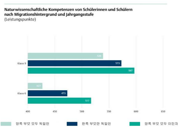 부모의 이민배경에 따라서도 아이의 학업성향이 다르게 나타나는 경향이 있다. 양쪽 모두 독일인 부모보다, 양쪽 모두 이민자 배경을 가진 부모의 아이가 이과계열 과목에서 더 강한 경쟁력을 갖는다고 한다. 이런 결과 탓인지 점점 더 많은 독일인들이 문과 성향이 강한 전공을 택하고, 외국인의 자녀는 이과 성향이 강한 전공을 택하는 모습이 보이기도 한다.
