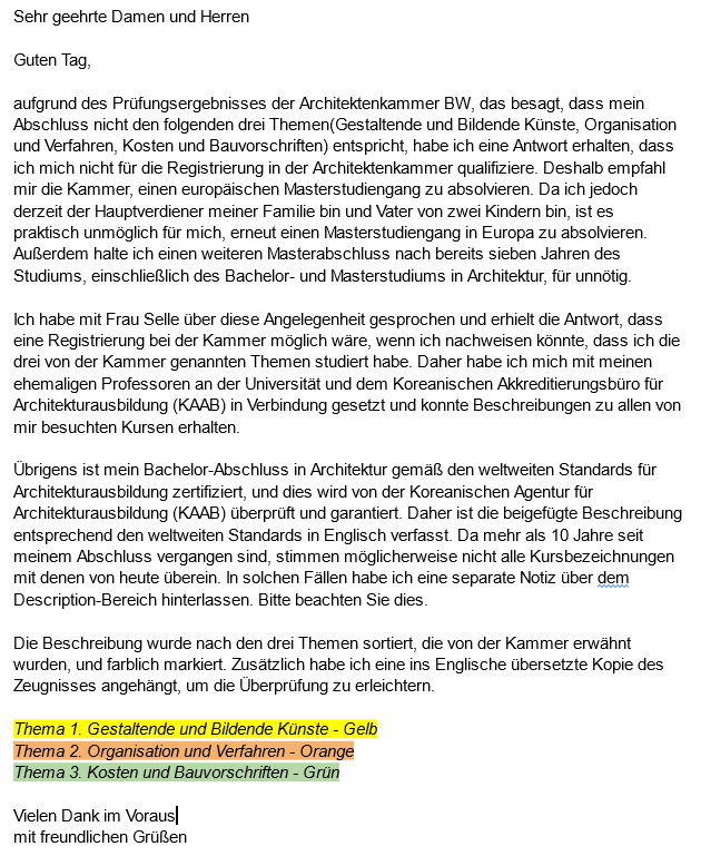 6. 협회와 전화 통화 시도 -> 독일의 공식기관인 ZAB에서 독일 학위와 내 학위가 동일하다고 인증받았는데 왜 등록이 안되냐고 재차 항의 -> 네가 받은 ZAB 결과가 positiv인지 negativ 인지는 중요하지 않고, 네가 3가지 교육과정(예술로서의 건축, 건축설계 과정, 건축비용과 법)을 배웠다는 것을 증명하거나 독일 석사가 있어야 한다는 답변을 들음 -> 3차 빡침 -> (한숨 쉬고 감정적으로 대응하면 안된다고 되뇌이며) 내 대학은 국제 인증을 받은 5년제 학사 학위이므로, 니들이 말한 3가지 교육과정을 충분히 증명할 수 있다. 그리고 나는 이미 석사 학위가 있는데 다시 한번 더 들으라는 건 불합리하고 현실적으로도 불가능하다. 나는 가장이고 돈을 벌어야 한다며 감정에 호소 ㅋㅋ -> 담당자가 감정적 호소에 동했는지 해당 교육과정을 증명하는 서류를 보낼 때, 내가 독일에서 석사 학위를 할 수 없는 이유(처자식을 먹여살려야 한다라는 이유)를 편지로 보내달라는 요청을 받음. 참내.