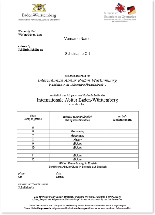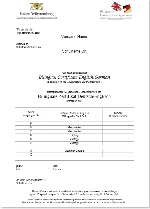 이중언어 교육의 목적은 학생들이 독일어를 포함해 영어를 기본언어로 교과목을 듣고 말하고 서술할 수 있는 수준으로 교육받는 것이며, 이는 국제 사회에 맞는 백그라운드를 갖추는데 목표가 있습니다. 이중언어 김나지움에 따라, 향후 학생들은 아비투어를 치를 때도 일부과목을 영어로 응시할 수 있습니다. 이에 따라 인터내셔널 아비투어 인증서와 이중언어 교육 인증서를 받게 됩니다. 그러나 모든 이중언어 김나지움에서 인증서를 발급하지는 않습니다. 자세한 내용은 아래의 김나지움 소개 란에서 추가로 설명하도록 하겠습니다.