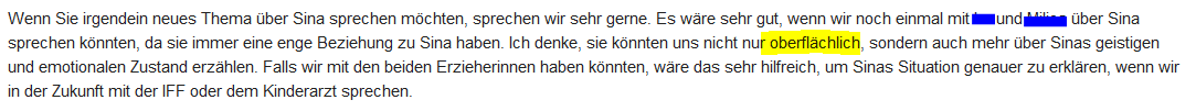 다시 상담 당시로 돌아가보자. 얼굴 뻘개지며 씩씩대고 있는 그녀 앞에서 우리는 이렇게 이야기했다. "이메일의 포커스는 신아와 더 가까이 관계맺고 있는 선생님들의 의견을 듣고 싶다는 것이었다. 아이가 말을 잘안한다면 어떤 상황에서 그런건지, 또 어떤 상황에서 말을 내뱉는지 같이 많은 시간을 보내는 선생님들의 이야기를 들어보는 게 맞지 않느냐? 우리는 그 얘기를 하고 싶었다. 그 앞의 oberflächlich를 강조하고 싶었던 것이 아니다"