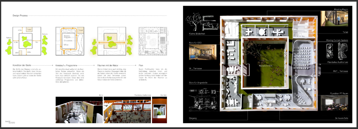 단편적인 예로, 만약 내 컨셉이 잘 드러나는 공간을 보여주고 싶다고 가정해보겠습니다. 평면도가 컨셉을 가장 잘 보여준다고 해서 한 페이지 안에 여러 평면도를 나열해서 보여주면 그 페이지는 쉽게 지루해질 것입니다. 하지만 평면도와 관련된 모형 이미지나 단면도를 (같은 페이지나 옆 페이지에) 함께 보여준다면? 보는 사람은 더욱 짧은 시간안에 쉽게 여러분의 프로젝트를 파악할 수 있을 것입니다. 따라서 프로젝트에서 내가 가장 보여주고 싶은 것(아이디어든 공간이든)을 어떤 조합의 표현방식으로 보여줄지도 고민해보는 것이 좋습니다.