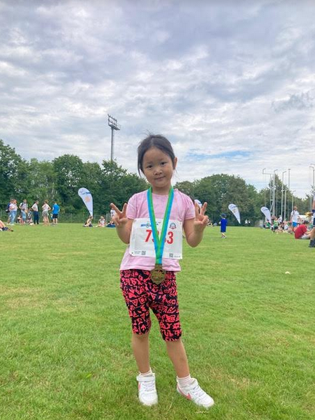 신아는 650m를 쉬지 않고 달렸다. 생각보다(?) 아주 잘 달려서 신아와 같이 뛴 아빠도, 뛰면서 영상을 찍은 엄마도 이게 뭔 일인가 싶었다. 음악에 맞춰서 춤추면서 신나게 달린 신아 역시 무사히 골인지점을 통과해 메달을 목에 걸었다.