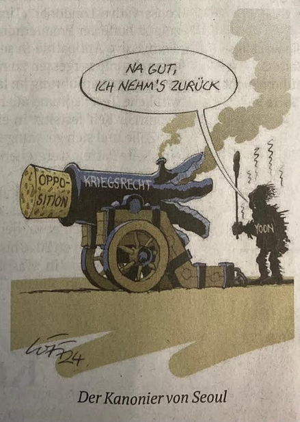 계엄령 덕분에 독일 회사에서 오랜만에 우리 가족의 안위를 묻는 질문을 참 많이도 받았다. 어떻게 설명을 해야할지 참 난감했다. 한국의 계엄령 헤프닝은 독일에서도 대서특필이 되고 있는데, 슈투트가르트 지역신문도 예외는 아니다. 아래는 계엄령 사태를 꼬집는 슈투트가르트 신문의 풍자 만화의 한장면. 그림 한장으로 현 상황을 잘 설명해놓은 것 같다.
