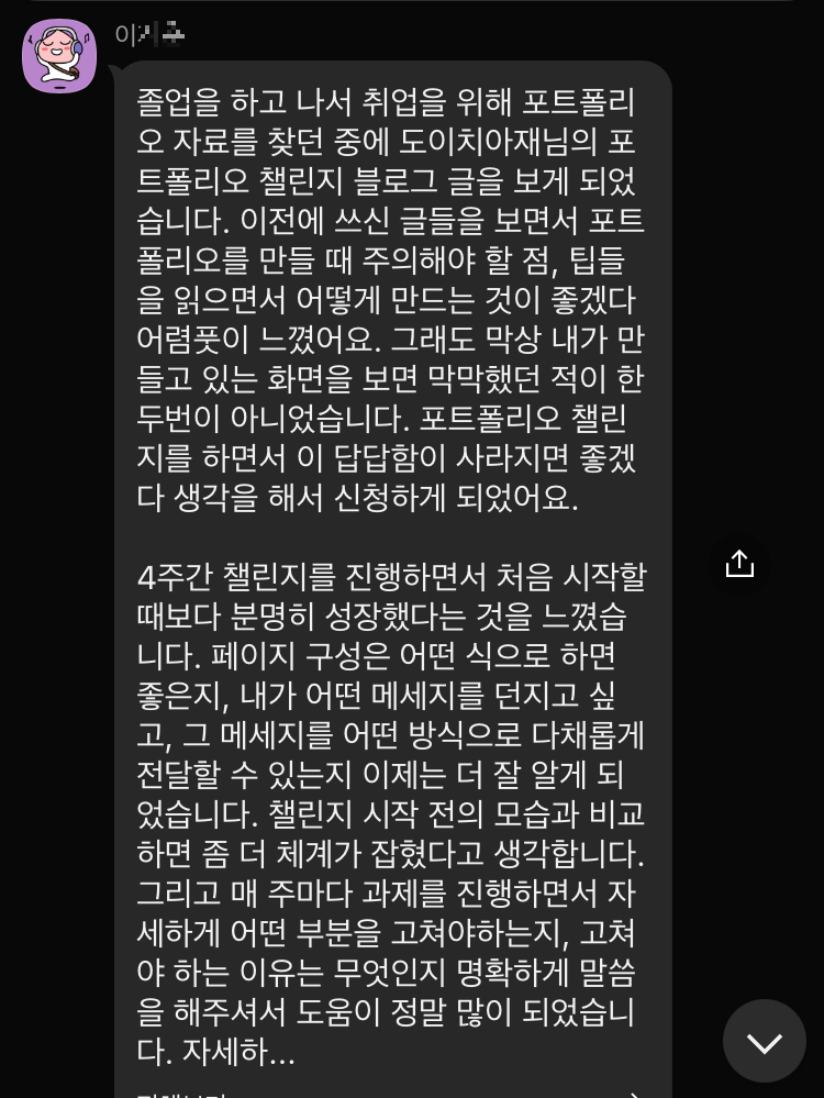 마지막 시간은 2시간이 넘도록 개인 포폴리뷰, 그리고 자기소개서에 대한 토론이 이어졌습니다. 만나 봬어 반가웠고, 앞으로 내딛는 사회의 첫 발걸음도 열렬히 응원할게요. 4주간 빠지지 않고, 정말 열심히 참여해주셔서 감사했습니다. 마무리는 참여자분들의 후기로 이만 마치도록 하겠습니다.