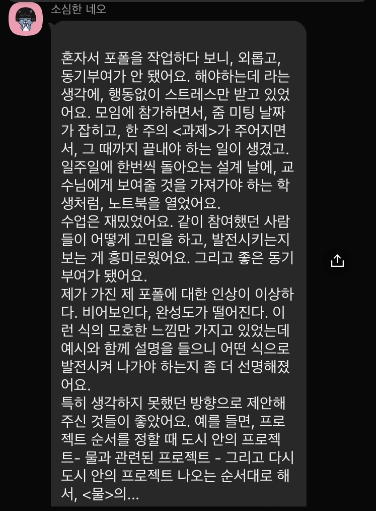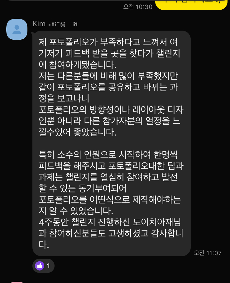 마지막 시간은 2시간이 넘도록 개인 포폴리뷰, 그리고 자기소개서에 대한 토론이 이어졌습니다. 만나 봬어 반가웠고, 앞으로 내딛는 사회의 첫 발걸음도 열렬히 응원할게요. 4주간 빠지지 않고, 정말 열심히 참여해주셔서 감사했습니다. 마무리는 참여자분들의 후기로 이만 마치도록 하겠습니다.