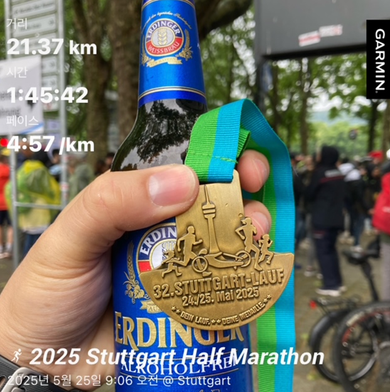 런닝 훈련 시간이 충분하지는 않았다. 한달 마일리지를 150km를 채우고 싶었지만 120km를 겨우 넘는 정도에서 그쳤다. 그래도 주말마다, 새벽마다 틈틈이 시간을 내서 달렸다. 하프마라톤은 오전 9시에 시작이었는데, 당일 아침엔 비까지 와서 너무 춥진 않을까 걱정하며 대회장에 도착했다. 비가 오든 말든 드디어 출발선에 섰고, 10km까진 정말 여유로웠다. 시작 후 6km정도까지가 오르막 구간으로 가장 힘든 구간이었는데 이상할 정도로 달릴만했다. 거리거리 마다 응원해주는 사람들의 응원 때문이었나보다. 페이스는 4분 40초~50초 사이로 달렸다. 처음에 나도 모르게 4분 10초 페이스로 달리고 있길래, 오버페이스 하지 않으려고 정말 참았던 것 같다. 그렇게 쭉 4분 중후반대 페이스로 달렸다. Bad Cannstatt로 돌아오는 18km 부근에서는 10km 참가자들과 합류했다. 길은 좁고 사람도 많아서 속도를 낼 수가 없었고, 더 속도를 낼 수 있었는데 그러지 못해 아쉬웠다. 아쉬운대로 메르세데스 뮤지엄을 돌아서 1시간 45분 42초로 하프 마라톤 레이스를 마무리했다. 아쉬움이 남지만 어쨌든 생애 첫 하프마라톤을 무사히 완주했다.